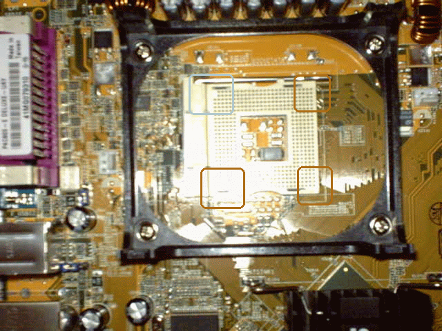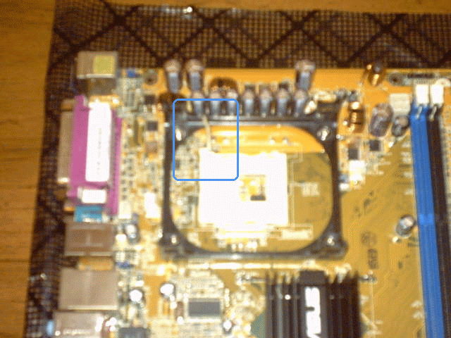 | So, it was time to install the CPU. For some reason I didn't take a picture of the chip before installing it, here's a picture of it's socket. Notice the top left corner doesn't have holes. The pins on the chip correspond so it can only go in one way. | ![]() |
