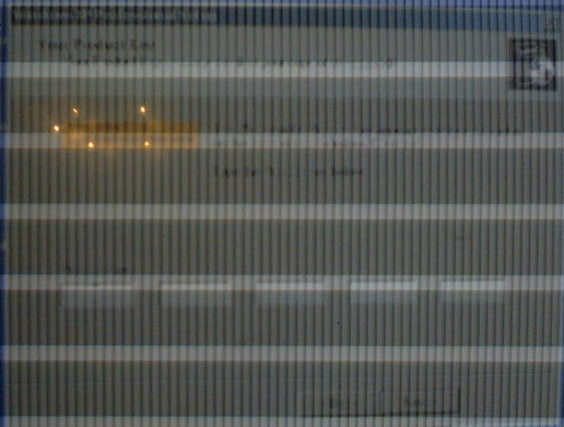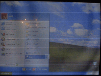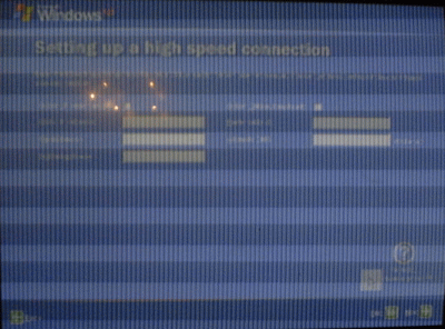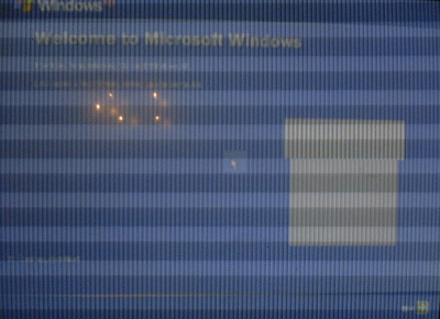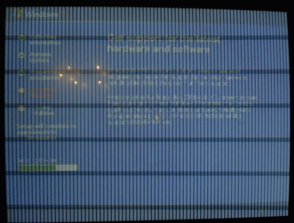 | OK, windows is setting up but as you see, it's hard to make out what's going on. Those vertical lines were actually on screen, not just bad photography. It's got its progress bar, checklist, and little messages, but don't ask me what any of it says. Either I couldn't read it in the first place or I just don't remember. | ![]() |