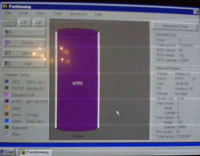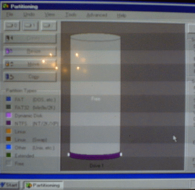 | First, I checked the windows disc and partition management. If I read this stuff correctly, it seems that adding or resizing partitions could wipe stuff out on existing partitions. Obviously I don't don't want that to happen. Using FDISK could do the same thing. In the past I've used a program called Partition Magic. It was pretty dynamic, letting me resize, add, and delete partitions without affecting existing partitions. Unfortuately, I couldn't reuse the version I had. It didn't say anything about Windows XP, but in its help file it mentions that it supports hard drives up to 80Gb. Since the drive I want to partition is 250Gb, I'll have to use something else. | ![]() |