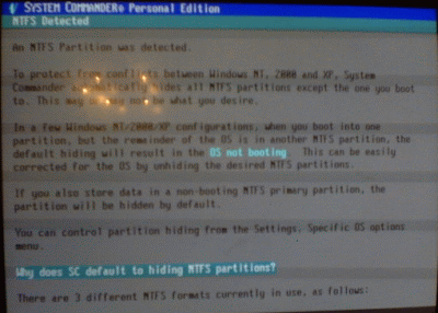 | I was hoping to just get the latest version of Partition Magic, but didn't feel like driving all the way to CompUSA or waiting for something in the mail. I got a program called Partition Commander cuz that's what I found at Staples. It came with something called System Commander which I didn't want, but it seemed to automatically install with the thing I wanted. System Commander seems to be a utility to have multiple operating systems on the same computer. After I installed it, it prompted me to select an operating system each time the computer restarted. Since I only have one and don't plan to install another, this was really annoying. After about 5 tries, I figured out how to disable it. | ![]() |
